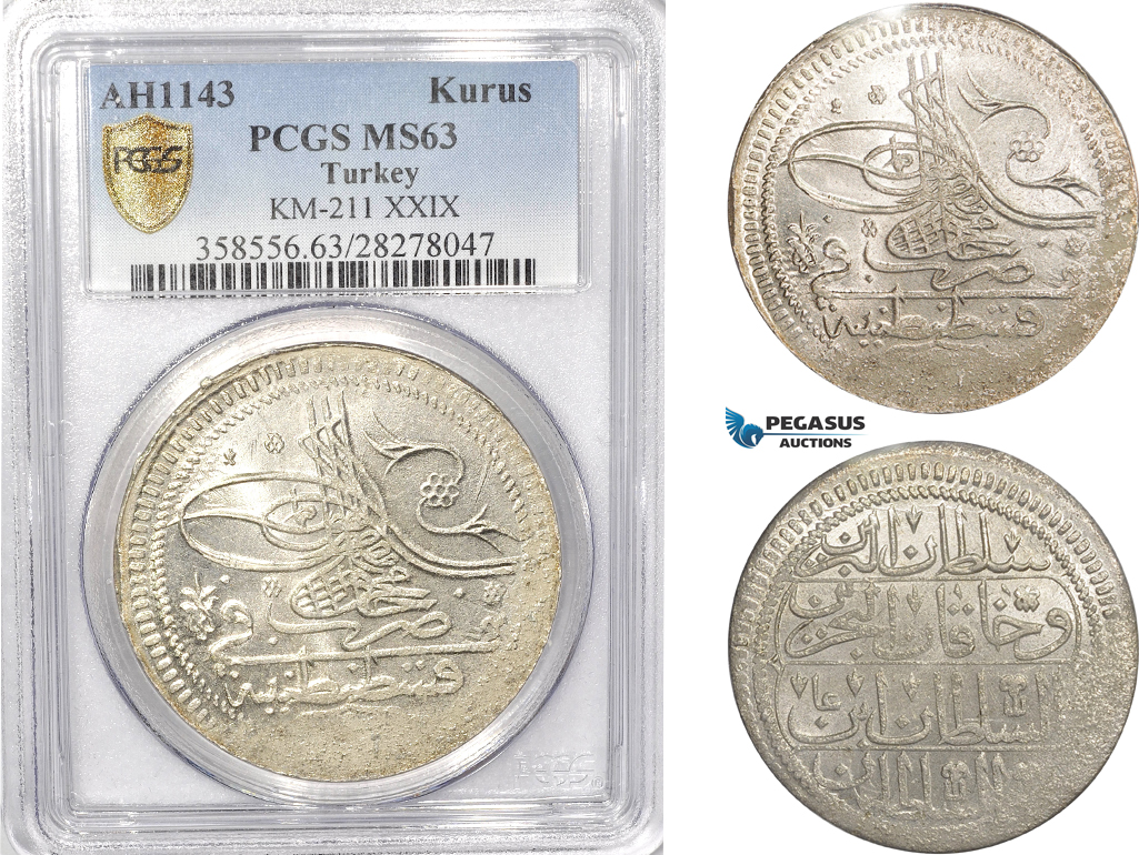 AB629, Ottoman Empire, Turkey, Mahmud I, Kurus AH1143, Kostantiniye (Istanbul) PCGS MS63, Rare Grade!