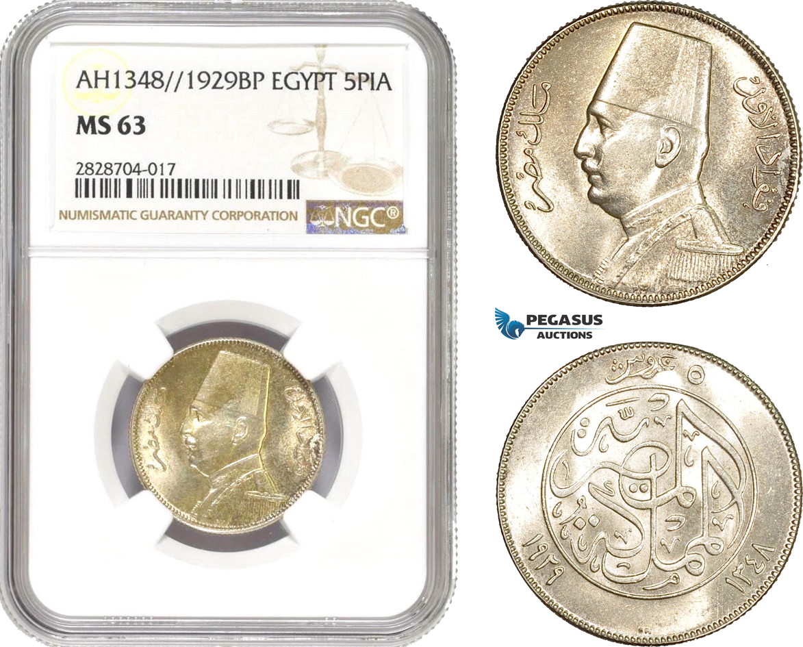 AC973, Egypt, Fuad, 5 Piastres AH1348 / 1929-BP, Budapest, Silver, NGC MS63