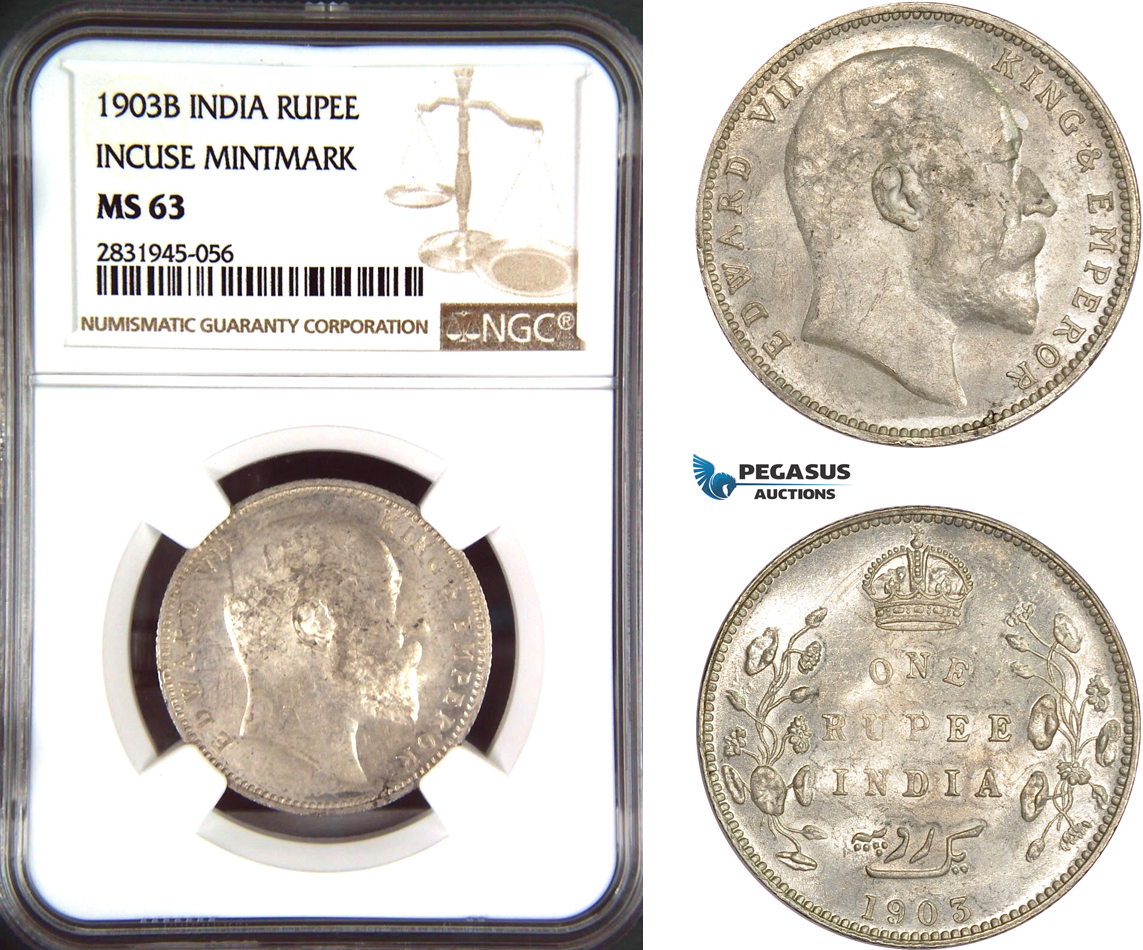 AD466, India (British) Edward VII, 1 Rupee 1903-B (Incuse) Bombay, Silver, NGC MS63
