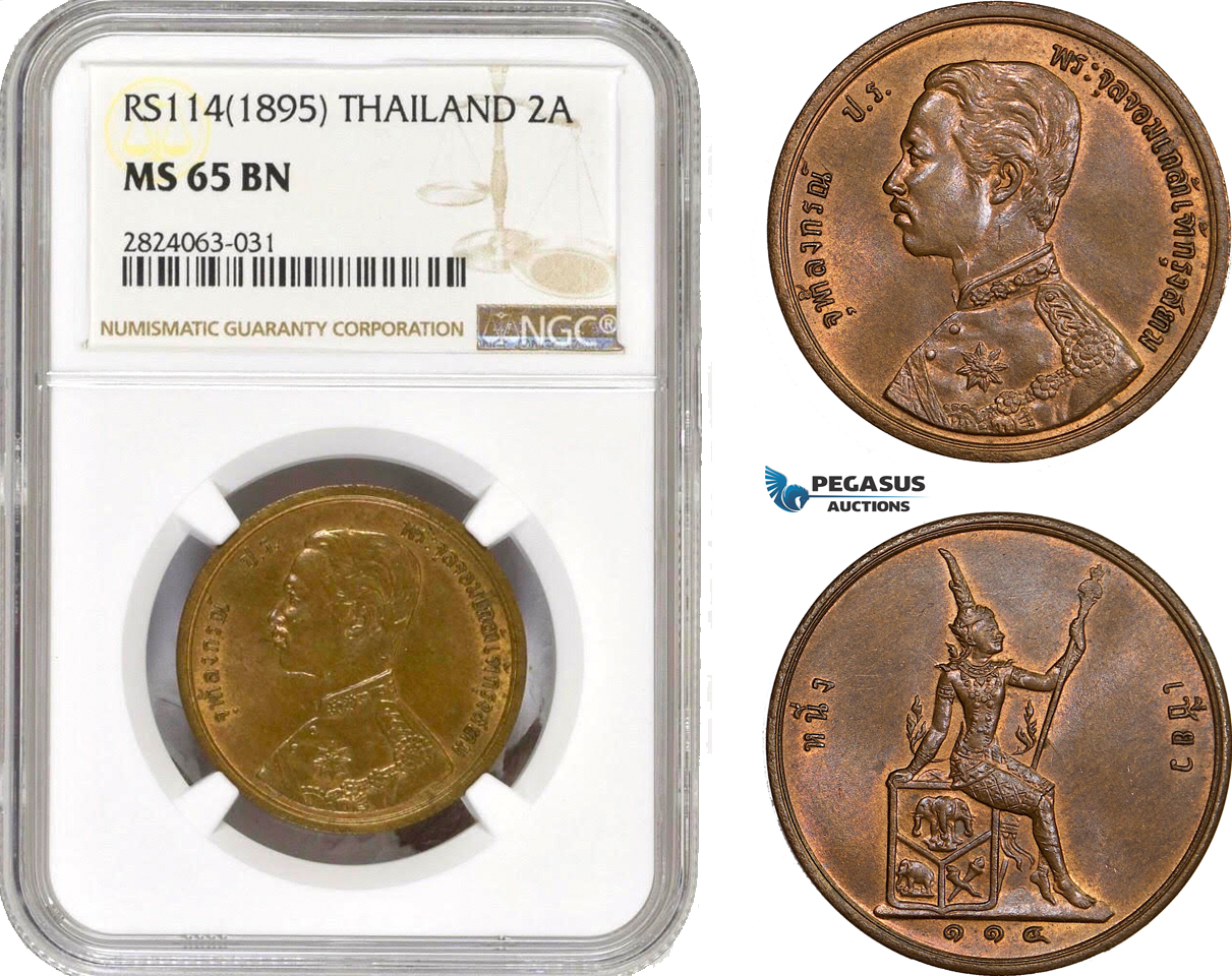 AD705, Thailand, Rama V, 2 Att RS 114 (1895) NGC MS65BN, Pop 1/0, Rare grade!