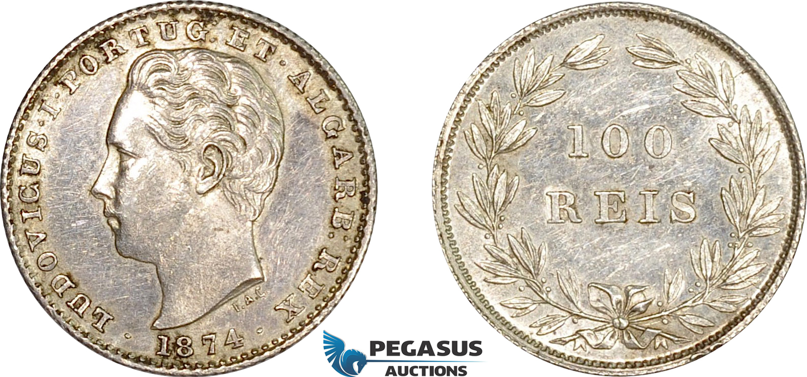 AE051, Portugal, Louis I, 100 Reis 1874, Lisbon, Silver, Cleaned XF