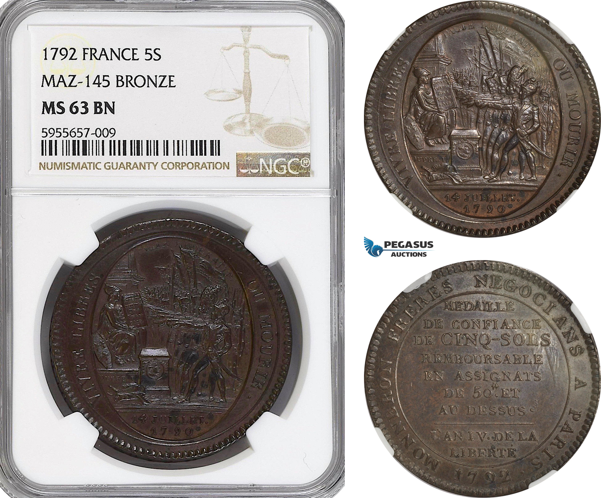 AG789, France, Louis XVI, 5 Sols 1792, Maz-145 Bronze, NGC MS63BN