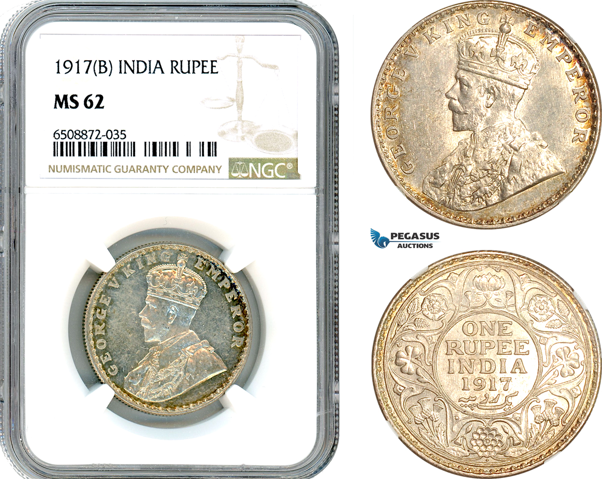 AH884, India (British) George V, 1 Rupee 1917 B, Bombay Mint, Silver, NGC MS62