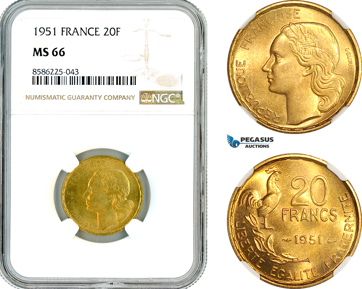 AL322, France, Fourth Republic, 20 Francs 1951, Paris Mint, “G. Guiraud”, NGC MS66