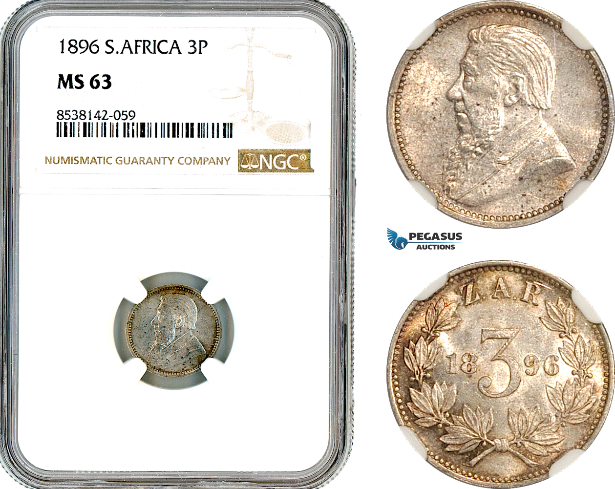 AL359, South Africa (ZAR) 3 Pence 1896, Pretoria Mint, Silver, NGC MS63