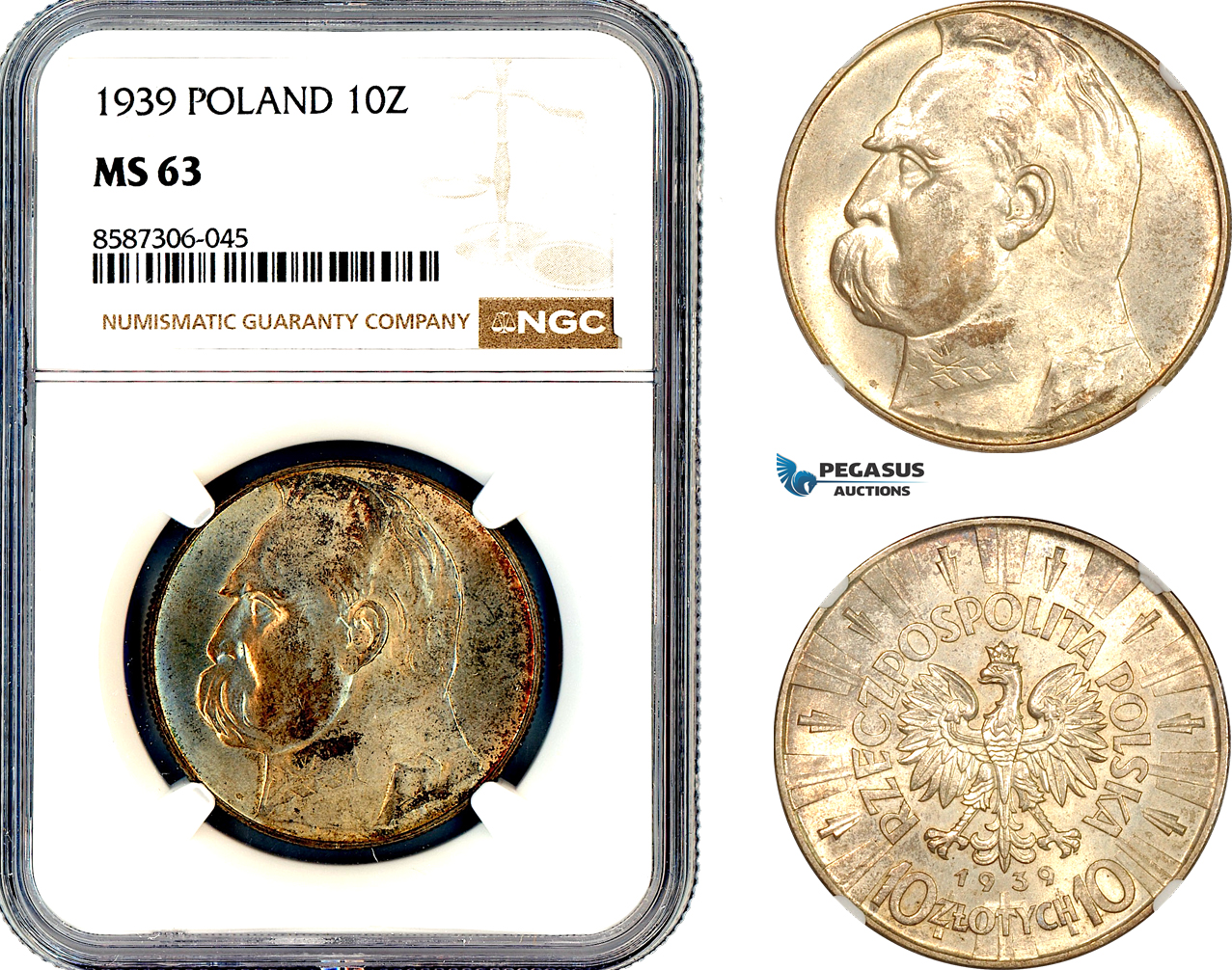 AL607, Poland, 10 Zlotych 1939, Warsaw Mint, Jozef Pilsudski, Silver, NGC MS63