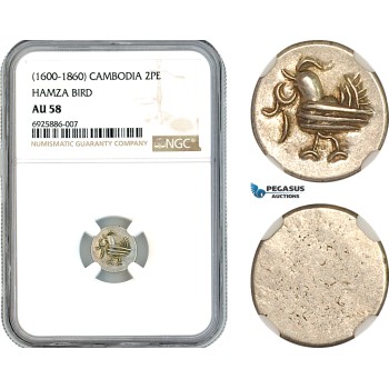 AK674, Cambodia, Uniface 2 Pe (1/2 Fuang) ND (1600-1860) Hamza bird, Silver, NGC AU58