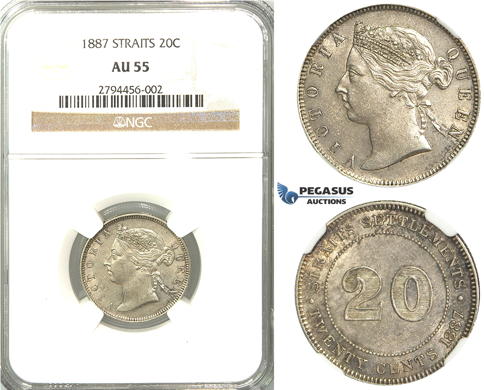 R420, Straits Settlements, Victoria, 20 Cents 1887, Silver, NGC AU55