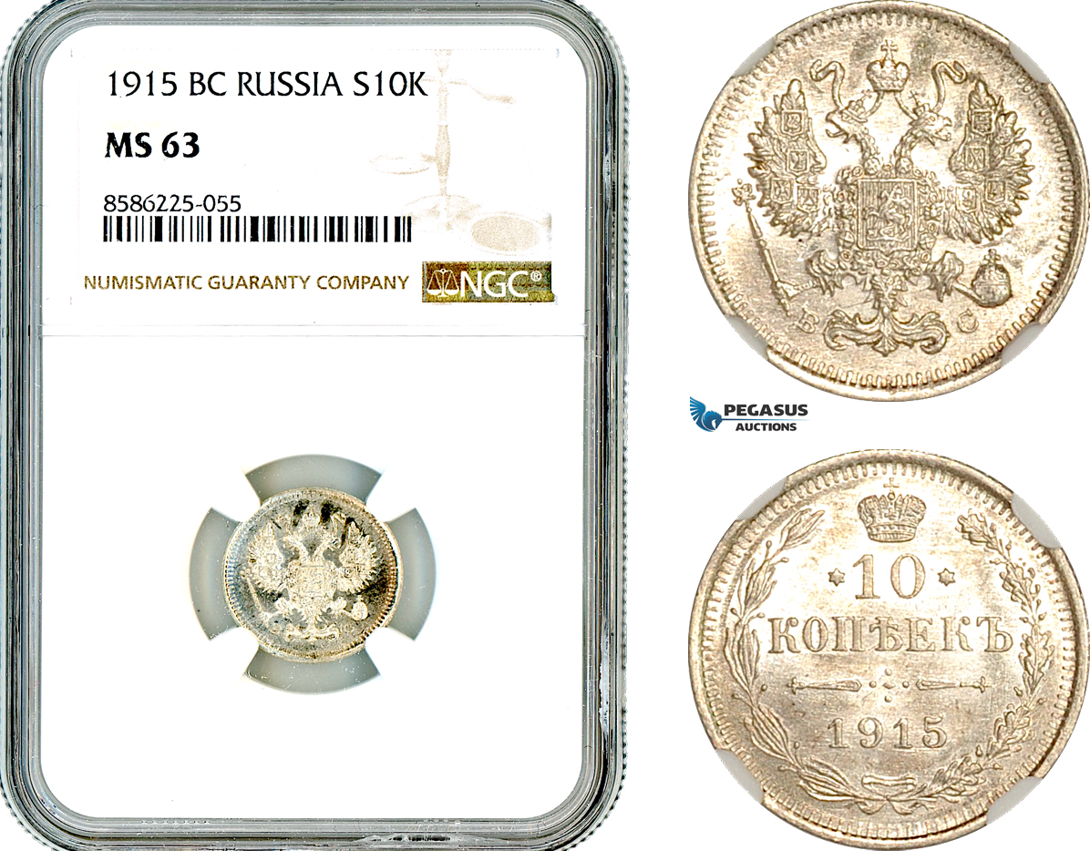 AL333, Russia, Nicholas II, 10 Kopeks 1915 BC, St. Petersburg Mint, Silver, NGC MS63