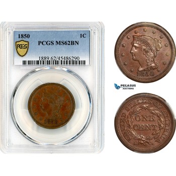 AK892, United States, Liberty Head Cent 1850, Philadelphia Mint, PCGS MS62BN