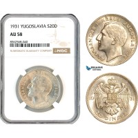 AK818, Yugoslavia, Alexander I, 20 Dinara 1931, Belgrade Mint, Silver, NGC AU58..