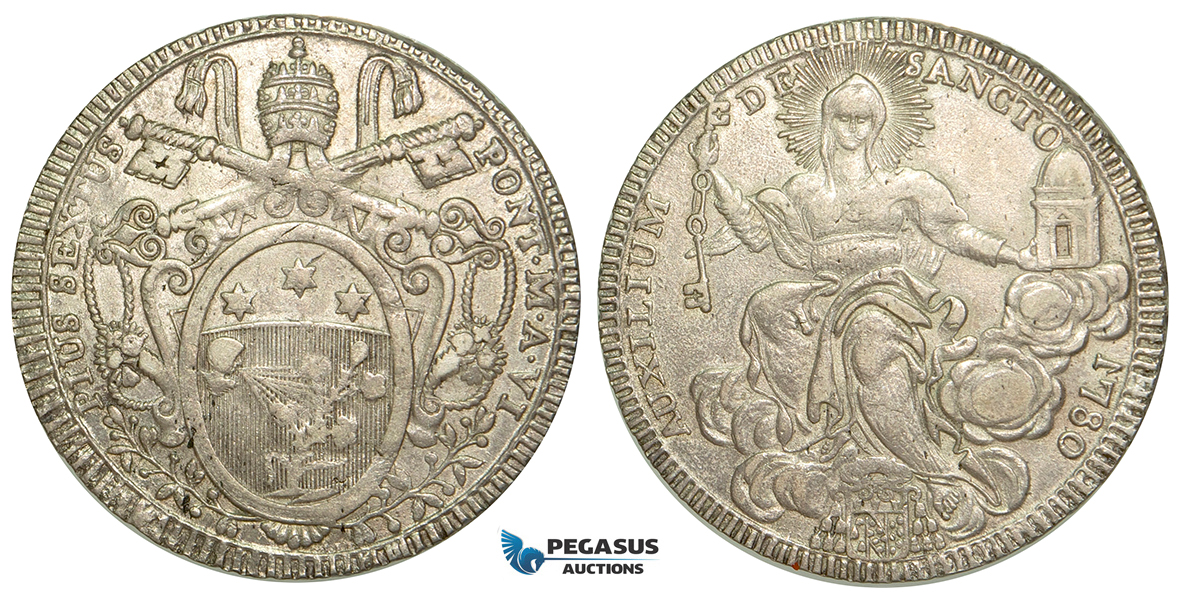 ZA77, Italy, Papal, Pius VI, Scudo 1780 (VI) Silver (26.28g) XF with lustre!